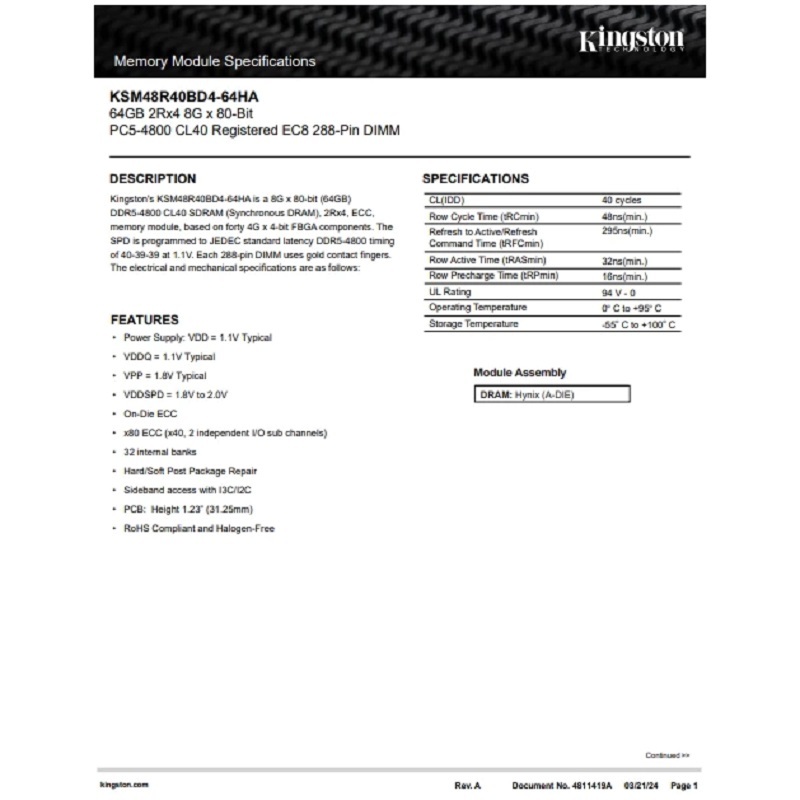 Kingston KSM48R40BD4-64HA DDR5 4800MT/s ECC Registered Memory DIMM