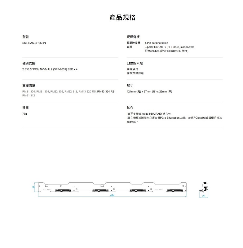 ‧磁碟支援:2.5"/3.5" PCIe NVMe U.2 (SFF-8639) SSD x 4