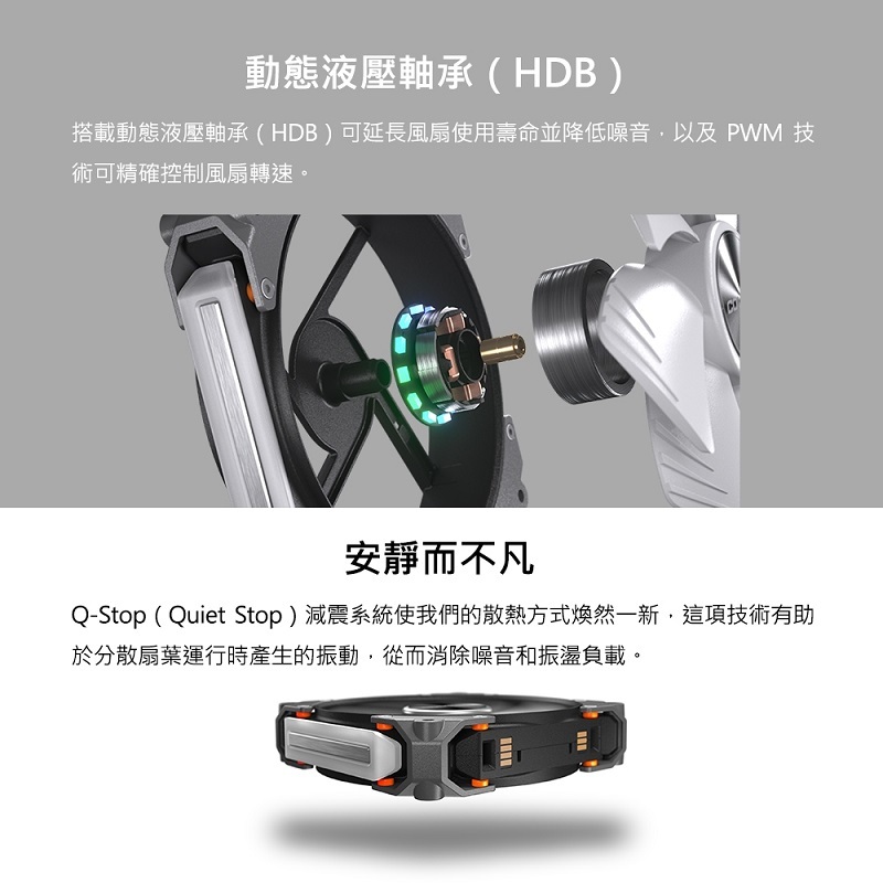 ‧HDB(動態液壓軸承)強化使用壽命並降低噪音;PWM 功能改善轉速控制。