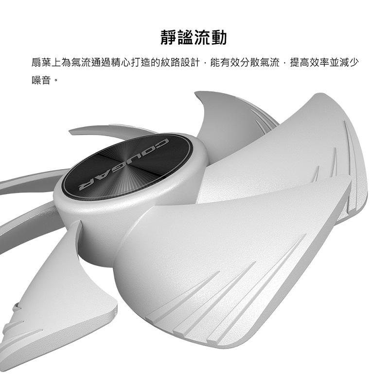 ‧扇葉上的紋路設計將氣流分散,有效提高效率並減少噪音。