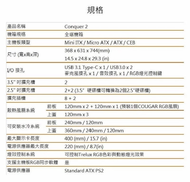 COUGAR 美洲獅 CONQUER 2 全塔機箱 可拆卸式內機殼