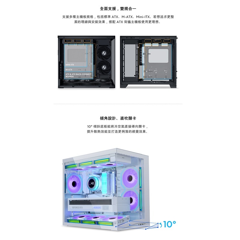‧支援 ATX、M-ATX、Mini-ITX 和 ATX Back-Connect 主機板