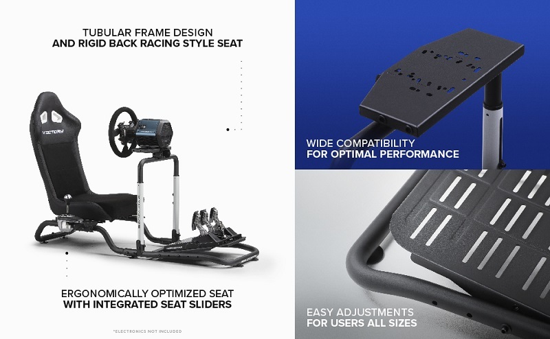 ‧Victory Simulator Cockpit 與中低價位的類比賽車電子設備相容,支援高達 10 Nm 的軸距,並且還與各種踏板和變速桿相容。