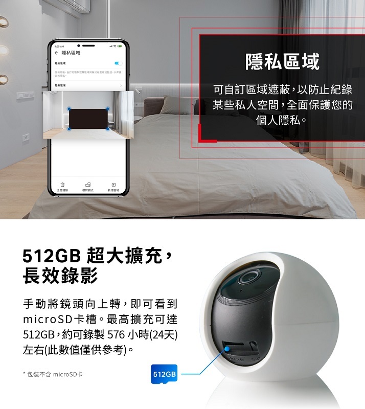 ‧安全儲存 : 將影像儲存在512GB的microSD卡上,安全隱私又便利(microSD卡需單獨購買)