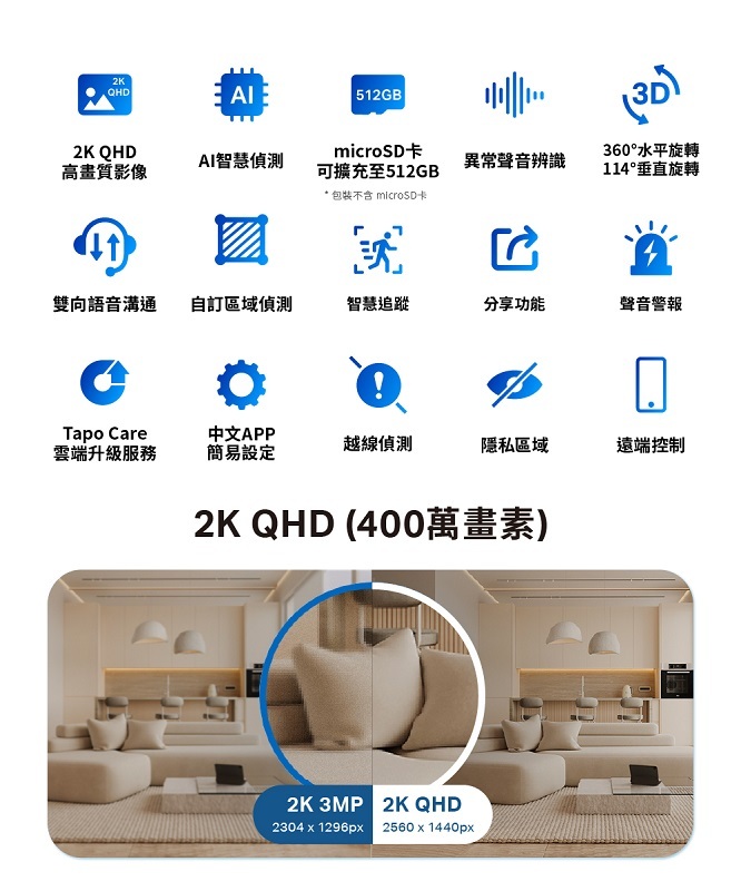 ‧高畫質影像錄製 : 2K 4MP QHD解析度,以卓越的清晰度捕捉每個細節