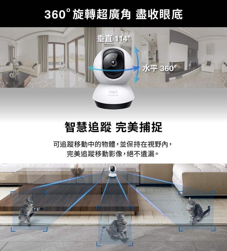 ‧寬廣的移動範圍 : 享受水平360°與垂直114°範圍,讓您覆蓋更多區域