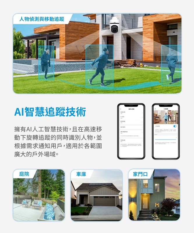 ‧人物偵測和移動追蹤 - AI智慧偵測在高速移動下旋轉追蹤的同時識別人物,並根據需求通知用戶