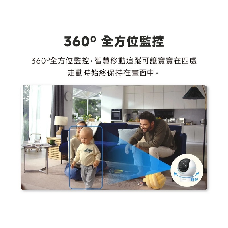 ‧體驗 360° 全景:平移和垂直功能可 360° 全方位查看您的育嬰室,智慧移動追蹤功能可讓您的寶寶在移動時始終保持在畫面中。