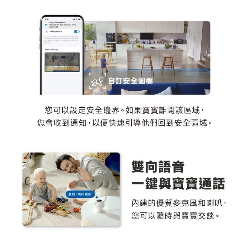 ‧安全圍籬:隨著寶寶的活動能力增強,您可以使用虛擬安全區設定邊界。