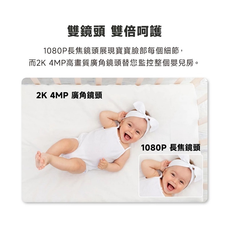 ‧雙鏡頭讓您清楚地看到寶寶的臉:1080p 長焦距鏡頭可展現寶寶臉部表情的每個細節,而廣角鏡頭則以 2K 4MP 解析度覆蓋整個育嬰室。