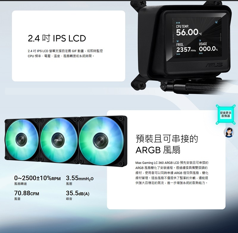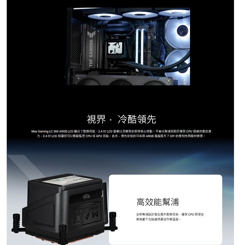 ASUS 華碩 MAX Gaming LC 360 ARGB LCD 一體式 CPU 水冷散熱器/90RC01G1-B0TAY0
