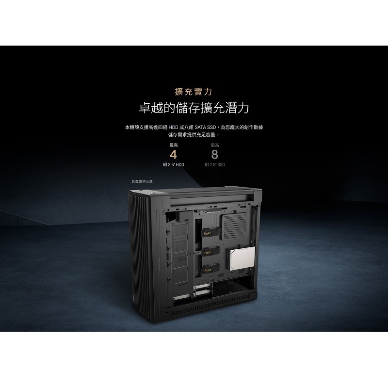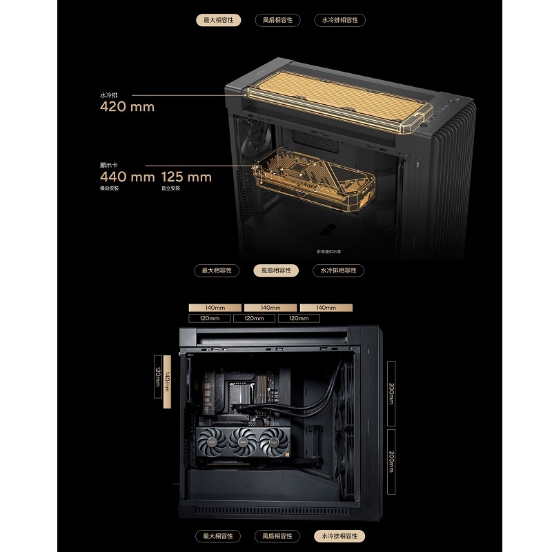 ‧海量空間,極限擴充: 支援長達 440mm 的顯示卡,可容納單組 420mm AIO 一體式或客製化水冷排,為最頂級的旗艦顯卡提供充裕的橫裝或直立安裝空間。