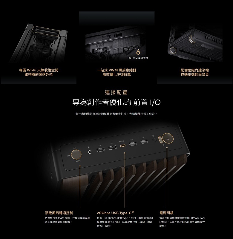 ‧豐富 I/O 介面: 配備電源閂鎖與兩段式 PWM 風扇控制切換;搭載 USB Type-C 20Gbps 高速連接埠。