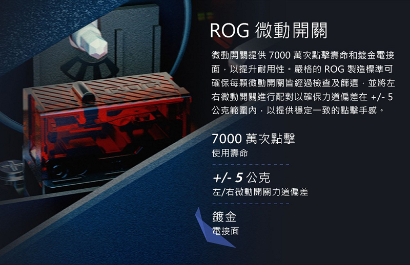 ‧ROG 微動開關提供穩定的點擊阻力以及 7000 萬次點擊壽命
