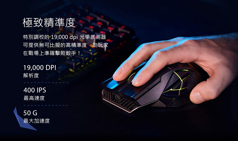 ‧領先業界的 19,000 dpi 光學感測器,有線與 2.4 GHz 連接模式皆能達到 1000 Hz 的輪詢率