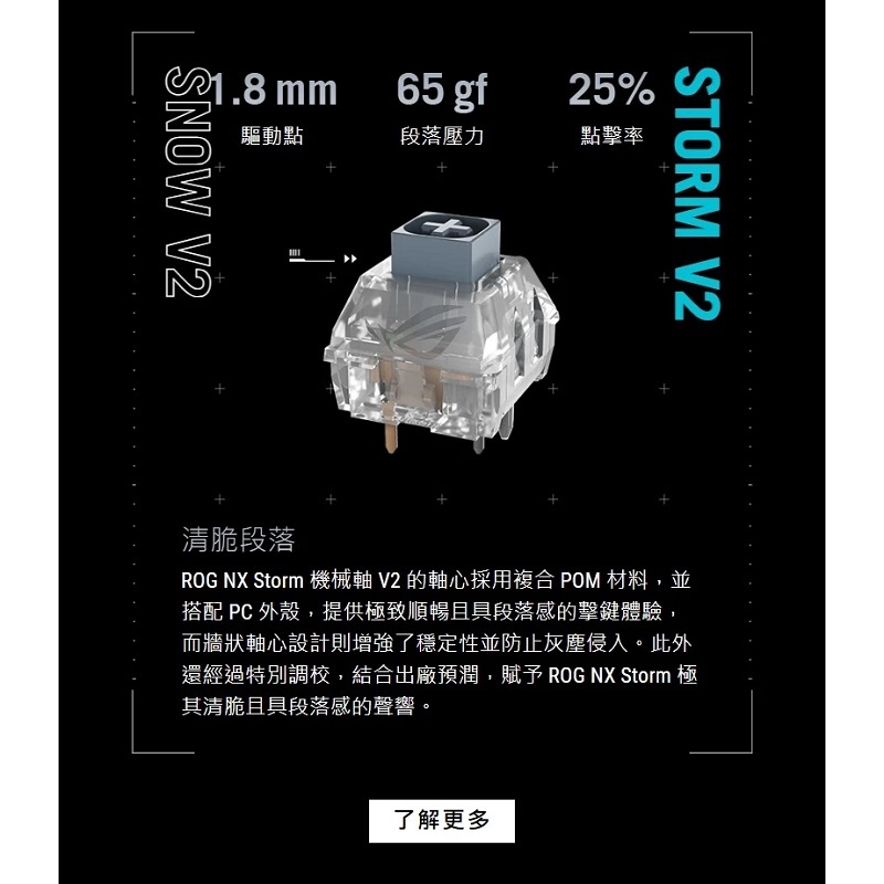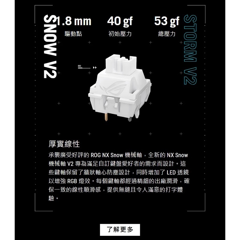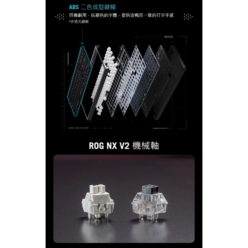 ‧可熱插拔 ROG NX V2 機械軸: 支援更多樣的鍵帽高度,同時提供柔和的聲學表現與精緻的打字手感。