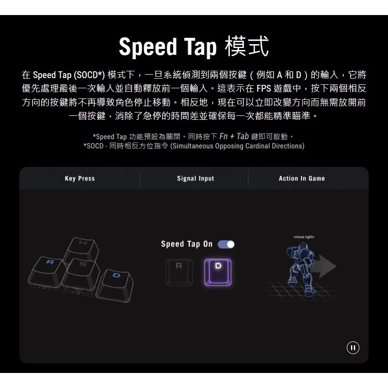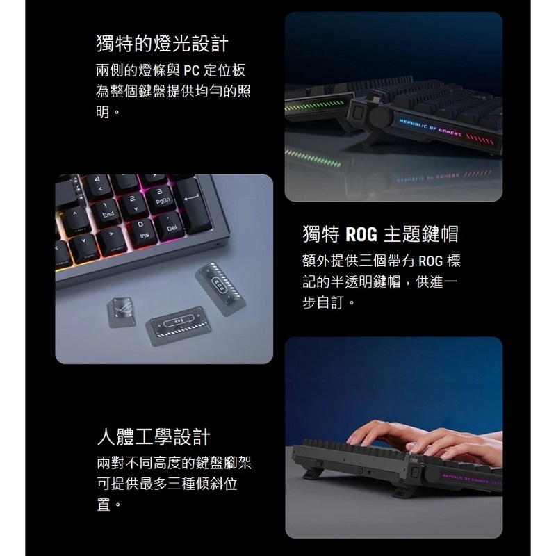 ‧獨特 ROG 主題鍵帽: 額外附贈 3 顆帶有 ROG 標誌的半透明鍵帽,提供更進一步的客製化選項。