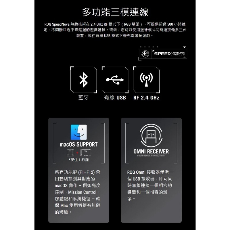 ‧三模連線: 透過 Bluetooth® (最多同時連接三台裝置)、具備 ROG SpeedNova 無線技術的 2.4 GHz 或有線 USB 進行連線。