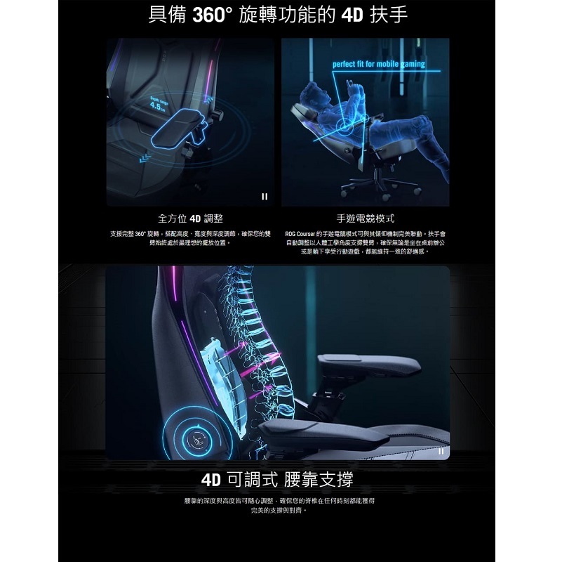 ‧4D 扶手: 具備全方位 360° 旋轉,以及高度、寬度與深度調節,為行動遊戲與桌面遊戲提供完美的手臂支撐位置