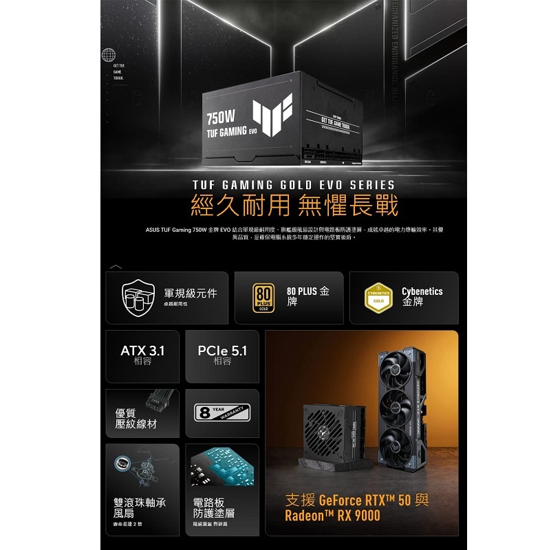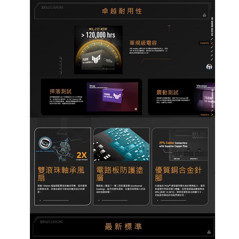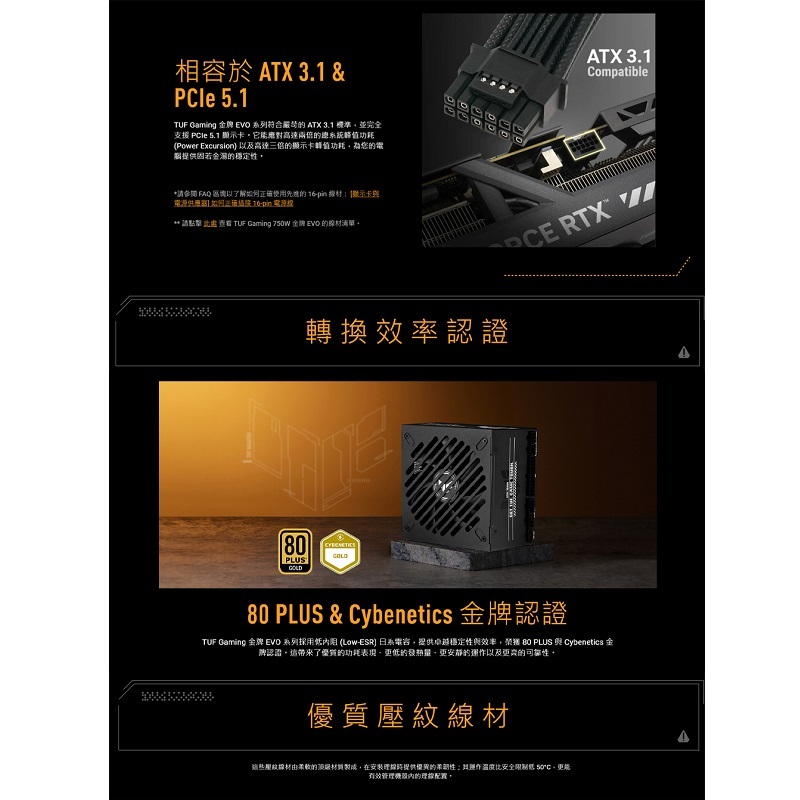 ‧相容於 ATX 3.1:ROG Thor 白金版 III 符合 ATX 3.1 標準,可確保為最新硬體增強電壓和電流調節。