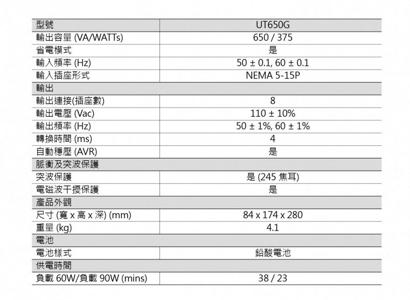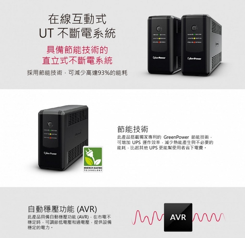 ‧CyberPower UT650G 為在線互動式不斷電系統,具自動穩壓功能,提供電腦、電信設備及儲存裝置穩定的電壓及電力備援。
