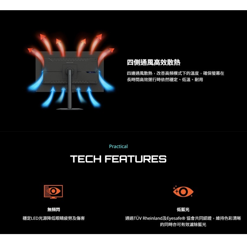 ‧低藍光,通過TÜV Rheinland及Eyesafe® 協會共同認證,維持色彩清晰的同時亦可有效濾除藍光