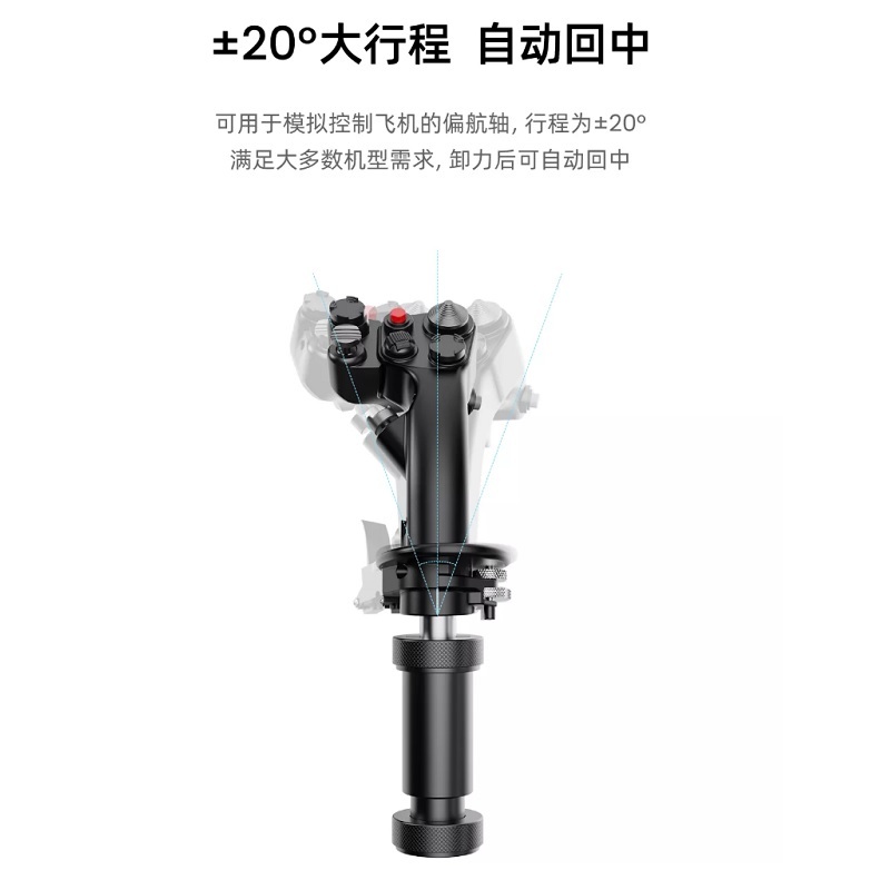 ‧±20°大行程 自動回中 可用於模擬控制飛機的偏航軸,行程為±20° 滿足大多數機型需求,卸力後可自動回中