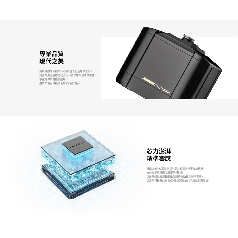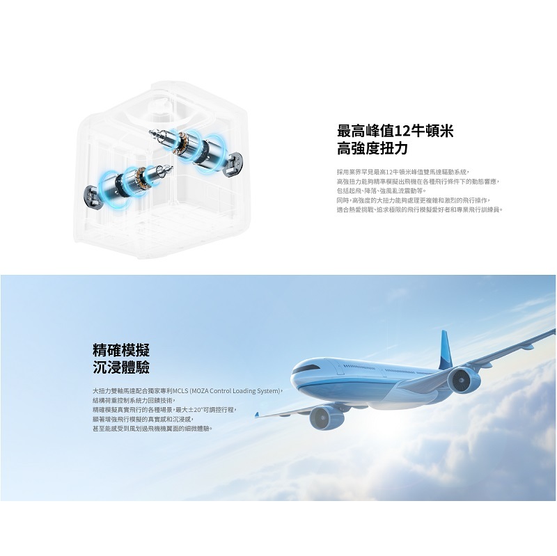 ‧高扭力雙伺服馬達與我們專有的MOZA 控制負載系統 (MCLS)相結合,提供精確的力回饋技術。最大可調±20°行程,精準模擬各種飛行場景,大幅提升飛行模擬的真實感與沈浸感。