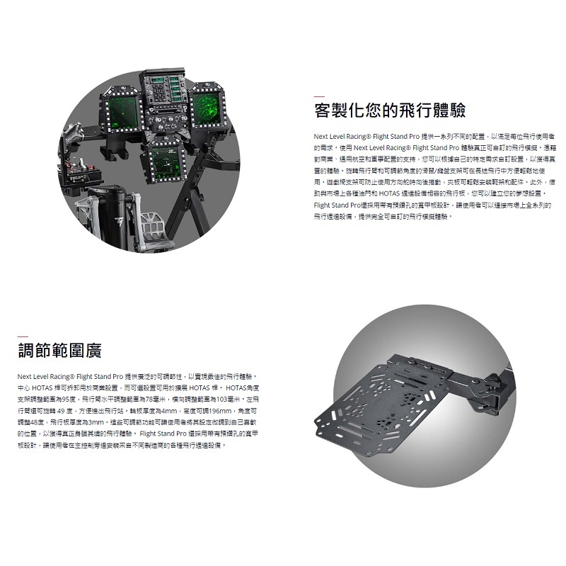 ‧具有高度和角度調節功能的中心 HOTAS 安裝桿可實現逼真的軍事配置。