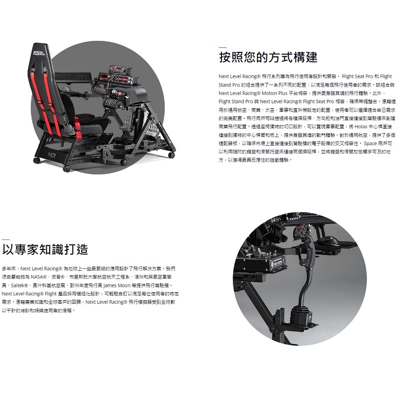 ‧為了讓 Next Level Racing® Flight Stand Pro 與運動產品相容,Next Level Racing® Flight Seat Pro 需要連接到 Flight Stand Pro 以形成完整的 Flight Simulator Pro 駕駛艙。運動組合:1X Motion Plus 平台和 1X Motion Platform V3。
