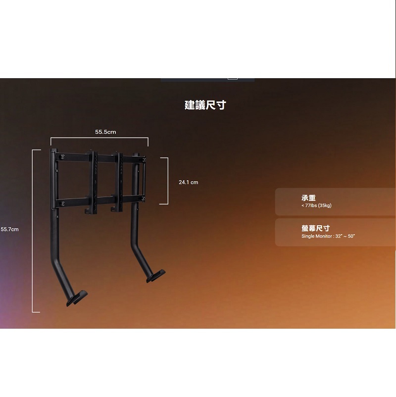‧此支架採用粉體塗裝鋼材製成,最大承重可達 35 公斤(77 磅),支援 32 吋至 50 吋螢幕安裝,讓玩家能以最彈性的方式安裝顯示器,打造身歷其境的模擬賽車體驗。