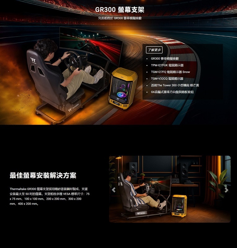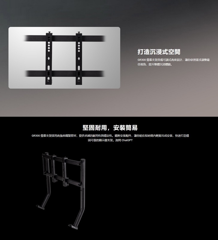 ‧GR300 螢幕支架專為 GR300 賽車模擬座艙打造,為進階賽車玩家提供完整的螢幕安裝解決方案。