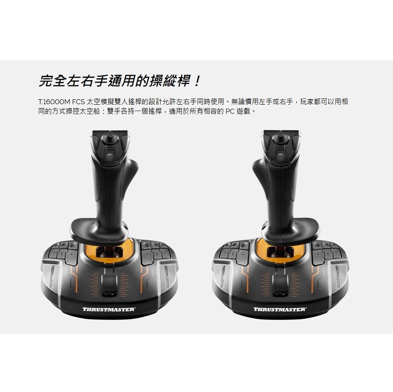 ‧Thrustmaster T.16000M FCS Space Sim Duo 結合了兩個 Thrustmaster T.16000M FCS 操縱桿,讓玩家能夠雙手操作,從而獲得出色的太空模擬體驗。