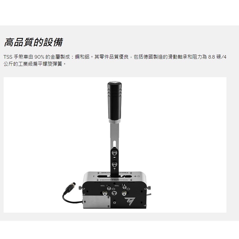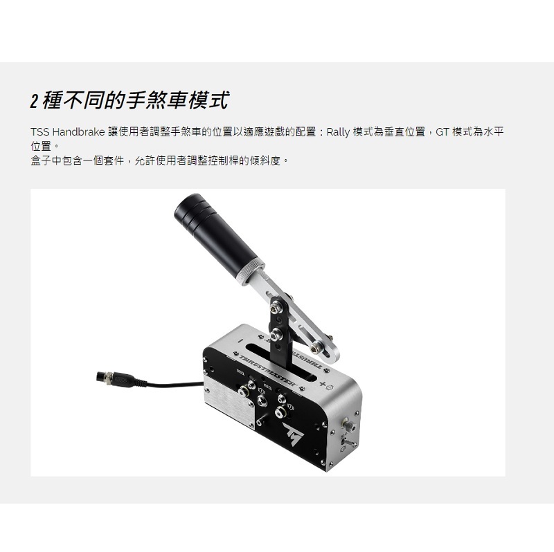 ‧TSS Handbrake 是 Thrustmaster 賽車生態系統的最新成員,具有多種賽車輪圈、踏板組、輪圈和附加組件可供選擇。 TSS ‧手煞車可以安裝在駕駛艙內,或連接到 TM 賽車夾(單獨出售)。