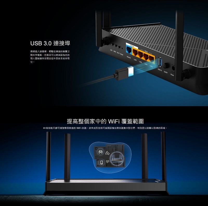 ‧2× 2.5G 連接埠: 1個2.5 Gbps WAN連接埠、1個2.5 Gbps LAN連接埠和3個1 Gbps LAN連接埠提供高速資料傳輸。‡