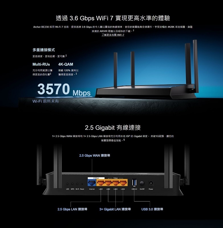 米特3C數位–TP-Link Archer BE230 Wi-Fi 7 BE3600 雙頻 2.5 Gigabit 無線網路路由器