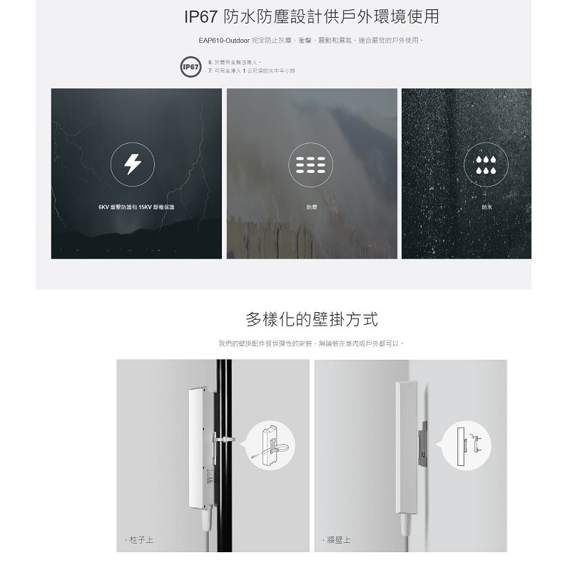 ‧長距離覆蓋: 特製的高功率放大器和專業的天線提供大範圍 Wi-Fi 覆蓋,IP67 防水防塵設計讓 AP 在戶外也不怕風雨侵擾