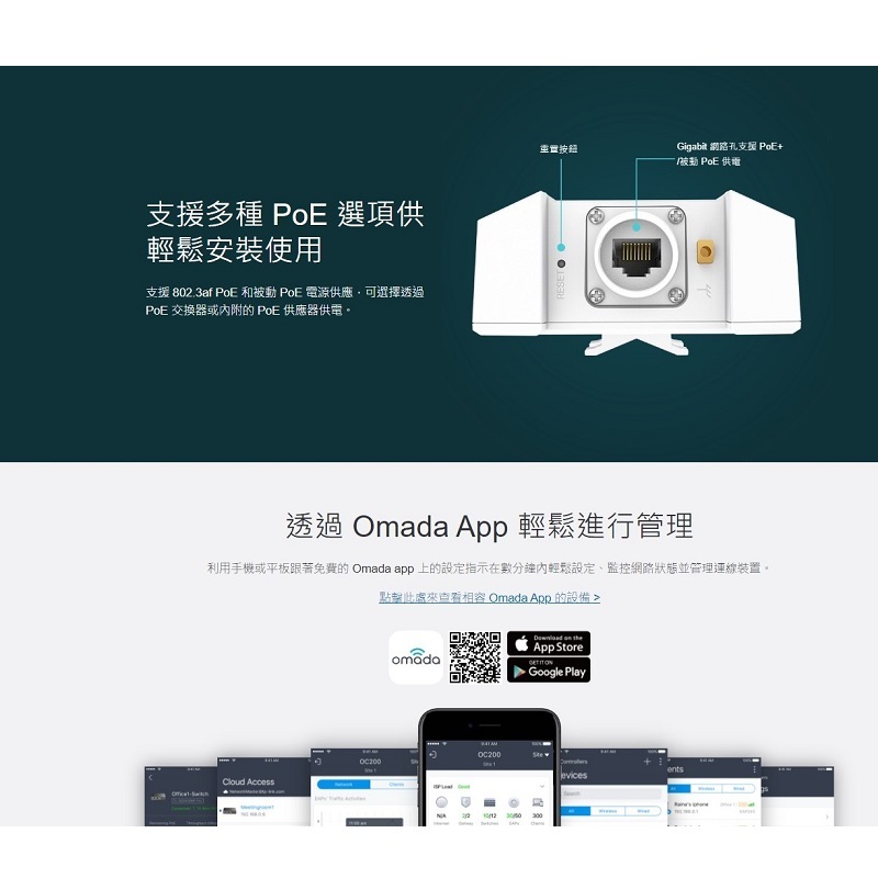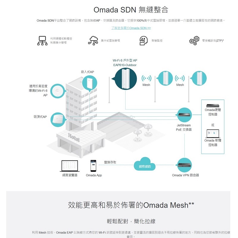 ‧集中雲端管理: 整合至 Omada SDN,提供雲端存取和本地管理