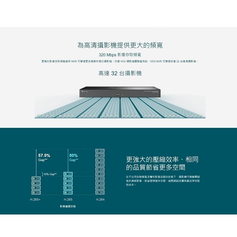 ‧320 Mbps 輸入及輸出頻寬:確保 NVR 可用較高解析度管理更多的攝影機。