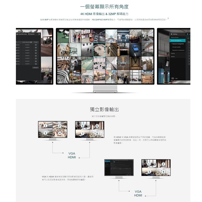 ‧1 6路 2MP / 8 路 4MP 解碼能力†:可使用的頻道更多,以及同時更多的即時影像檢視及回放。