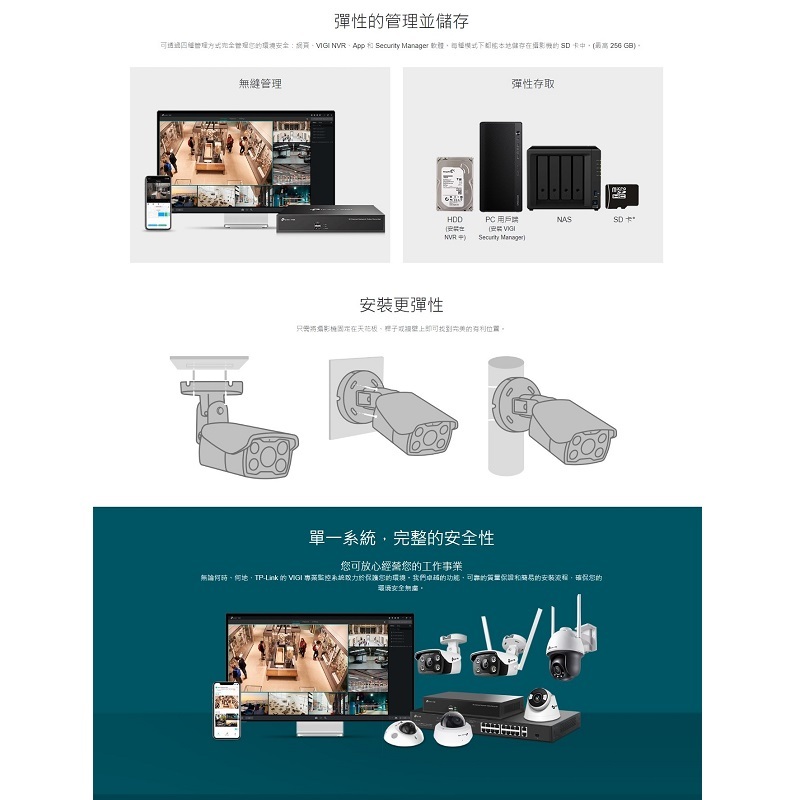 ‧彈性管理及儲存: 可透過四種管理方式進行管理: 網頁、NVR UI、VIGI app 和 VIGI Security Manager。每種方式都能本地儲存,也能連接 SD 卡 (最高 256GB) 進行儲存